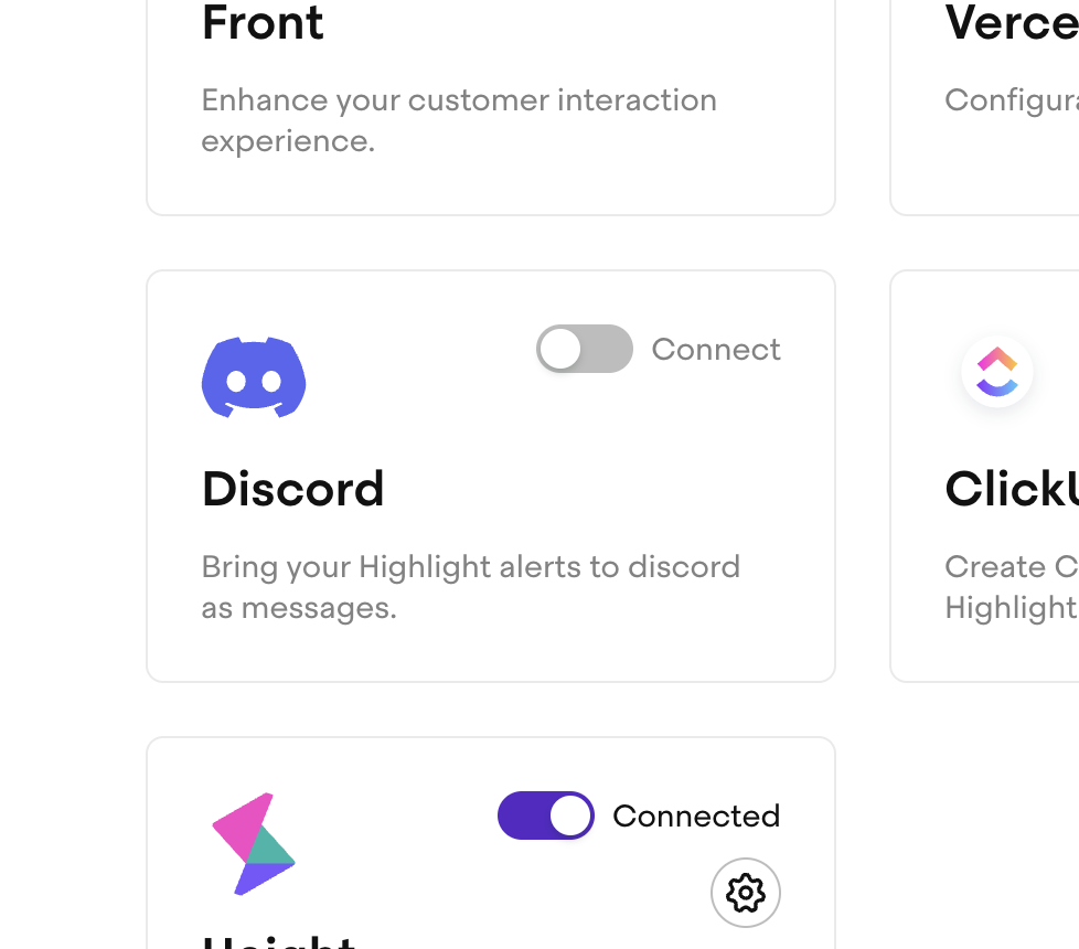 To get started, go to app.highlight.io/integrations and click the toggle to turn on the discord integration.